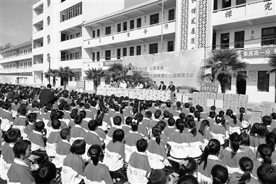 10月23日,由信阳日报社与广东太阳神集团联合发起的“爱沐山区、心系未来”主题捐助活动在平桥区肖店乡中心学校举行。当天,广东太阳神集团指派营销总部人员来到信阳日报社的帮扶联系单位——平桥区肖店乡,向该乡中心学校捐助价值10万元的生活用品。图为捐赠仪式现场。