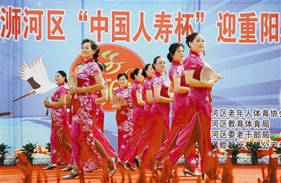 日前,信阳市映山红模特艺术团在由浉河区老年人体育协会和浉河区文体局、浉河区老干局举办的2012年浉河区“中国人寿杯”迎重阳老人秀比赛中表演的节目《高天上的流云》,力压群芳夺得一等奖。图为该艺术团的队员们在比赛时的场景。