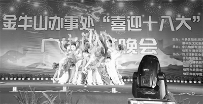 近日,浉河区金牛山办事处在红军广场举办了“喜迎十八大”广场文艺晚会,相声、快板、小品、二胡合奏、舞蹈等16个节目精彩纷呈、雅俗共赏,近千名群众观看了演出。图为演出现场。