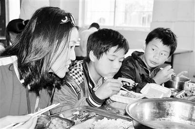 日前,由安利志愿者组织的督导队前往新县陡山河中学和陈店乡小学,对“春苗营养计划”学校营养厨房建设情况进行督导。“春苗营养计划”是安利公益基金会携手中国关心下一代工作委员会,共同推出的重点公益项目,旨在整合政府、民间力量,为农村贫困地区留守儿童集中的寄宿制学校建设营养厨房。图为督导队志愿者与学生们一起就餐。