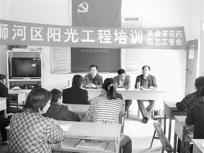 浉河区吴家店镇湖塘村党组织第一书记张玉文积极探索农民科技培训新方法,以各种形式把农民感兴趣、急需的信息和技术送到农民家门口。今年以来,该村开展实用技术培训4场(次),培养各类技术人才50余人,受教育群众千余人,使数十人走上了致富路。图为日前浉河区阳光工程培训在该村开班时的情景。