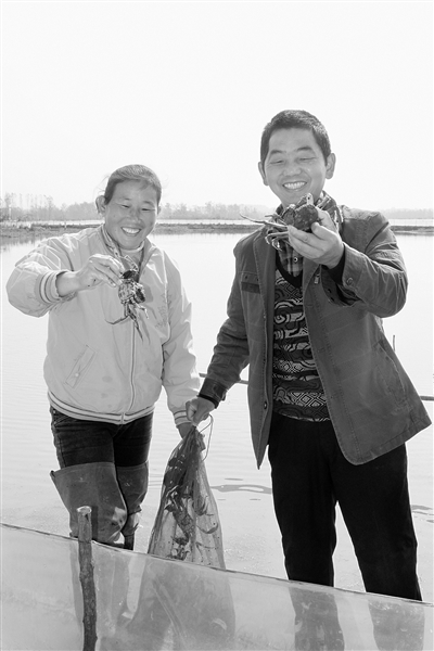 平桥区胡店乡农民胡振义外出打工期间,学习并掌握了大闸蟹养殖技术,回乡后创立了西湖农民合作养殖社,带动周边农民养殖大闸蟹脱贫致富,受到了周边农民的高度称赞。图为日前喜获丰收的胡振义手拿大闸蟹喜笑颜开。本报记者 孟 磊 摄