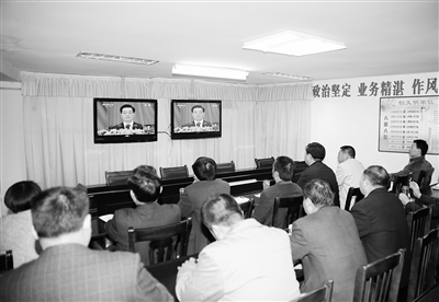 11月8日上午,平桥区平西党工委组织机关、社区全体干部职工集中收听收看党的十八大开幕盛况。 海 龙 摄 |