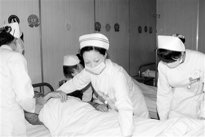 近年来,解放军154医院脊柱外科病区在护理工作中,牢固树立“以病人为中心”的服务理念,严格执行《医院实施优质护理服务工作标准》,开展“优质护理服务示范工程”,为伤病员提供安全、优质、高效的护理服务,为医疗工作的开展和伤病员的康复提供了坚强保障。图为该病区护士长万艳红(右二)带领护士为病人服务的情景。