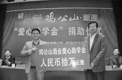 日前,由鸡公山酒业有限公司举办的“鸡公山酒业爱心助学金”捐助仪式在信阳师范学院举行。仪式上,鸡公山酒业有限公司董事长朱耀辉表示此次捐赠助学活动,是鸡公山酒业感恩社会,担当社会责任的善举。图为朱耀辉向师范学院领导转交助学金。