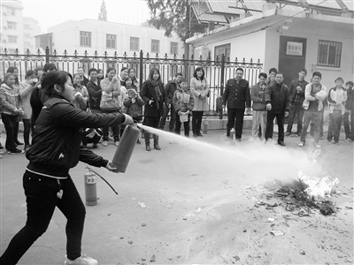 日前,市特殊教育学校举行了“火场逃生、扑灭初期火灾”消防安全演练活动。图为该校学生正在进行灭火模拟演练。