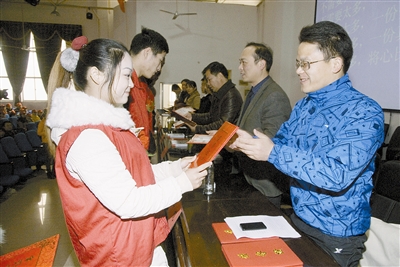 12月5日,潢川县举行首届民间志愿者服务奖颁奖仪式,对志愿服务事业作出突出贡献的个人、单位和企业进行了颁奖。图为中国十大杰出青年志愿者叶榄(右一)为潢川县志愿者颁奖。