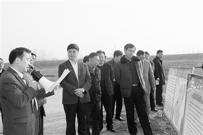 12月6日,省农业厅党组成员、农业产业化办公室主任马国明一行先后深入文新公司、信阳国际茶城、平桥区甘岸镇、罗山县竹竿镇观摩标准粮田建设和农业产业化集聚群建设工作。图为马国明(前排左二)在罗山县竹竿镇观摩标准粮田建设时的情景。本报记者 黄 铎 摄