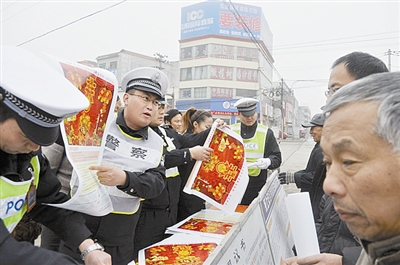 近日,信阳交警部门以不断提升全民交通守法意识、安全意识和功德意识为目标,在全市范围内掀起了主题为“遵守交通标志信号,安全守法文明出行”的“12·2”交通安全日宣传活动。上图为辖区交警深入客货运汽车内向交通参与者宣传遵守交通信号的重要性。右图为辖区交警将“122全国交通安全日”主题内容印成年历挂画向群众宣传发放。黄 平 摄