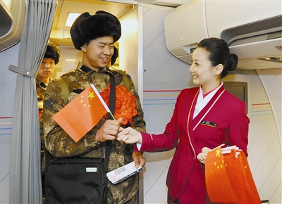 12月10日,南航机组人员为乘机的新兵们准备了国旗作为礼物。