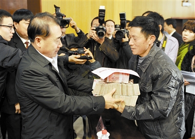 12月11日,河南省高院院长张立勇(左)将欠薪执行款交到农民工代表手中。
