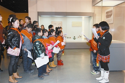 近日,信阳博物馆开展“小小讲解员”培训交流活动,来自羊山新区第五小学10名小朋友承担了志愿讲解任务。该活动也是信阳博物馆开展学习党的十八大精神主题实践活动的内容之一。图为小讲解员们正在练习讲解词。