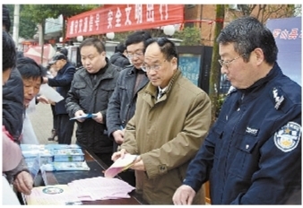 近日,罗山县交警大队在辖区设置交通安全咨询台,向广大交通参与者宣传交通安全法律法规,同时邀请县政府领导及交通安全委员会成员单位负责人亲临现场解疑释惑。图为该县县政府副县长尹晓亮(右二)在活动现场发放宣传材料时的情景。