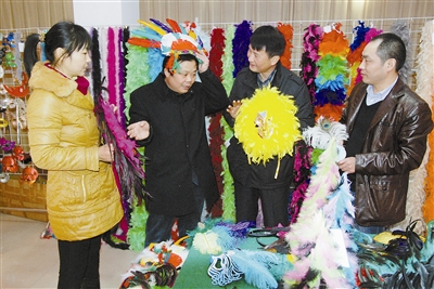 近年来,河南潢川县羽饰工艺制品有限责任公司,在当地农村信用社的支持下,采用“公司+基地+农户”的产业模式,把羽毛产业做强做大,生产的羽毛装饰品远销亚、非、欧、美等50多个国家和地区,带动周边1万多农民从事羽毛加工。
