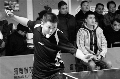 1月1日到2日,信阳国威乒乓球训练基地举办了一场“钻石杯”乒乓球大赛,来自全市民间的乒乓球爱好者将近200人、43支球队报名参加了比赛。经过两天捉对厮杀,最终红房子队、强能强材队和兄弟联盟队分获冠亚季军。图为选手在比赛中。