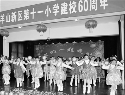 日前,羊山新区第十一小学隆重举行了建校60周年文艺晚会。羊山新区管委会有关领导,十一小学离退休老领导、老教师和师生代表一起观看了文艺演出。图为晚会现场。 张德兵 摄