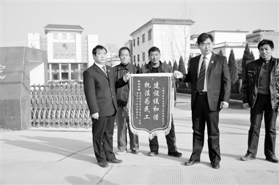 日前,罗山县法院不断加大执行力度,切实维护农民工合法权益,确保被拖欠工资的农民工在春节前能够足额领到工资。图为被拖欠工资的农民工代表向该院执行法官送去锦旗表感谢。董王超 摄