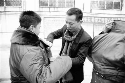 信阳强能新型墙材有限公司总经理熊爽生是2012年全市十大杰出青年之一,虽然年轻,但他却热衷于公益事业,经常去敬老院、儿童福利院看望孤寡老人和孩子们,还设立了熊爽生助学基金。近日,他又来到信阳市特殊教育学校,拿出4万元给学校的孩子们购买了学习用具和御寒用的棉衣、手套。图为熊爽生在给一个孩子试穿棉大衣。