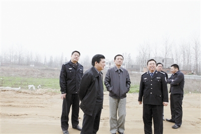 3月20日上午,市委常委、政法委书记、市公安局局长李长根在市委副秘书长、市信访局局长谢天学的陪同下深入息县调研信访工作。图为李长根(左三)视察息县公安局办公大楼工地建设进度情况。