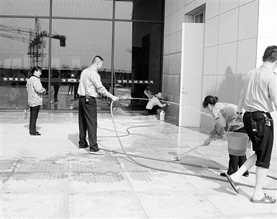 为营造良好的节日氛围,迎接信阳第21届国际茶文化节,全市各部门掀起了美化市容市貌的热潮。昨日,记者在高铁信阳东站,看到工作人员正在冲洗、清扫车站的各个死角,为往返“茶都”的旅客打造一个舒适整洁的出行环境。