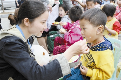 5月31日上午,在市残疾人联合会,我市社会各界向市残联康教中心的残疾儿童进行了爱心捐赠。市检察院、信阳锦江国际大酒店、信阳巨人教育培训学校等单位、企业共捐赠了价值6万元的学习生活用品和爱心礼物。图为爱心人士喂小朋友吃蛋糕。本报记者 杨 柳 摄