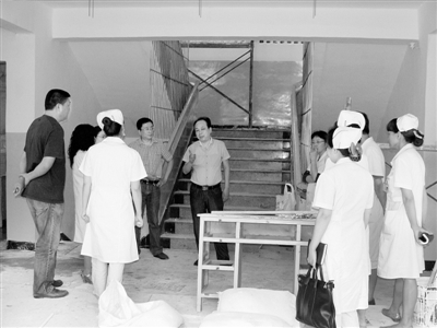 为认真落实市长乔新江在信阳职业技术学院附属医院病房楼建设项目工程现场办公会上的讲话精神,加快项目建设进程,该院领导高度重视,合理规划建设方案,积极做好搬迁前的各项工作。图为院长王健、项目主管院长范玉峰等与该院相关科室负责人在施工现场。