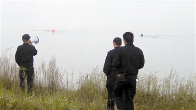 贤山办事处水源保护中心加大对燕尾岛一级水源保护区集中整治力度,早晨六点对前来燕尾岛冬泳的人员进行治理,并做好水源保护宣传和解释工作。图为执法队员规劝冬泳者。