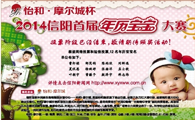 | 冠名企业 详情点击信阳新闻网http://www.xyxww.com.cn 根据网络投票和短信投票,12名年历宝宝名单公布如下: 曹轩铭 邹茂钧 陈雨欣 刘鲜逸 夏悦恩 徐琬婷 张赫洋 孟士钦 叶朝宇 曾谦予 殷泽宇 韩志炜 信阳首家休闲娱乐购物精致体验中心——怡和·摩尔城,是新怡和集团旗下商业巨舰,坐落于东方红大道中段,雄踞� |