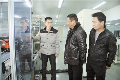 河南天扬光电科技有限公司积极坚持科技进步,不断加大投资发展力度,自2011年1月落户信阳后,三年迈出了三大步。图为该公司总经理许力(中)在三期扩建生产车间向厂长尹伟光(左)了解新机械设备安装调试的情景。