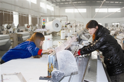 今年以来,为进一步推进产业集聚区建设,淮滨县川大有限公司积极购置喷水织布机、螺丝机、道筒机等先进设备1000台,现已全部投产,年产值达3亿元。图为昨日工人正在淮滨县川大有限公司生产车间工作。