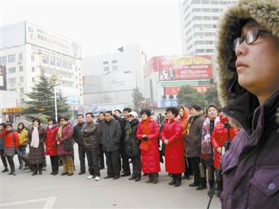 图为观众在寒风中驻足观看。