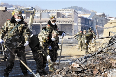 1月13日,武警官兵在云南香格里拉独克宗古城清理火灾后的废墟。