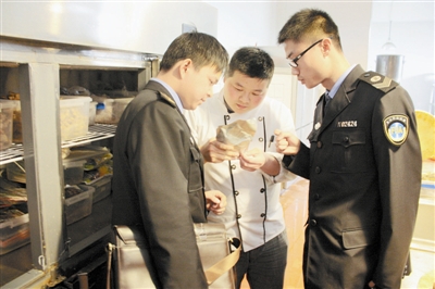 为进一步强化食品安全责任,规范食品安全秩序,日前,市食品药品监督局对市区餐饮行业进行了检查。图为工作人员检查时的情景。本报记者 赵 锐 摄