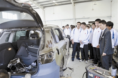 3月26日上午,信阳师院华锐学院、润洲汽车销售服务有限公司合作办学暨“实践教学基地”“实训就业基地”揭牌仪式举行。图为仪式开始前,华锐学院理工系汽车服务工程专业的学生在润洲汽车公司观摩汽车维修。