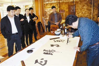 为更好地推广茶文化,信阳安信茶叶有限公司以茶文化生活馆为平台,经常邀请书画名家品茗论艺。图为3月26日,书法家在安信茶文化生活馆交流书法技艺时的情景。