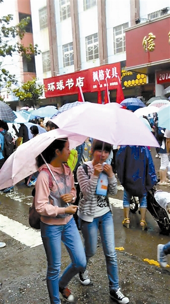 两个女生撑着伞,有说有笑离开考场。