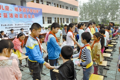 日前,罗山县法院在该县楠杆镇中心校隆重举行“关爱留守儿童,城乡孩子手拉手”社会公益活动启动仪式。仪式上,城镇结对儿童向农村留守儿童赠送了口袋书,有关领导向留守儿童发放了学习用品。