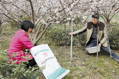 近年来,浉河区以“早大红”樱桃种植为龙头,带动乡村向生态、宜居、宜游方向发展。老百姓的钱袋子鼓了,生产的积极性格外高涨。图为昨日该区一种植大户翟普兵(右)夫妇正趁目前天气晴好、墒情充足的有利时机给果树追肥。