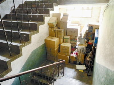 堆放在楼梯拐角处、紧挨电线,与电表箱“相伴”的易燃杂物。