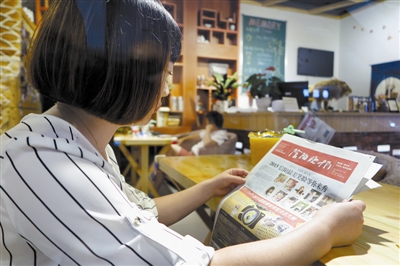 昨日,记者在天润广场某店内发现,顾客在品尝鲜榨果汁的同时仔细翻看《信阳晚报》。店老板表示,摆放《信阳晚报》是该店的特色服务之一,因为这上面有着身边最具特色的民生百态、生活杂谈等内容,而且明年的晚报他已提前征订了。