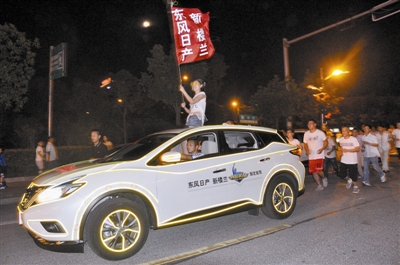 8月29日夜晚,百花园夜跑的人群中多了一队年轻而又富有朝气的人群,他们在美女旗手的带领下,一路小跑,挥洒汗水。据了解,这一幕是东风日产信阳威通店发起的新楼兰“兰夜炫跑”活动,参与者为新楼兰车主和东风日产信阳威通专营店员工,活动旨在让大家强身健体,释放激情,缓解压力。图为活动现场。