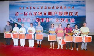 “俗话说,远亲不如近邻,近邻不如对门。今天我们为小区居民搭建一个邻里互动交流、互助友爱的平台,让大家愿意走出家门,用微笑和问候拉近邻里之间的距离,让陌生的人熟悉起来,让疏远的人亲近起来,让小区的事大家共同参与进来,让我们居住的小区充满幸福感、安全感和归属感!”日前,随着主持人一番充满激情的开场白,三里店社区合惠园小区第一届“五星级文明户”授牌仪式暨首届“邻里节”文艺汇演拉开帷幕,小区居民在文明户评选和文艺表演中尽享邻里互助和友爱。