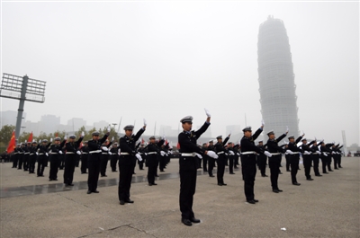 11月9日,郑州交警进行交通指挥手势演练。 当日,郑州市公安局举行了一场由千余名警力参加的“素质强警年”活动成果汇报演练,参演人员进行了警棍盾牌操、多警种反爆恐合成作战等8个科目的演练。据介绍,郑州市公安局希望通过“素质强警年”活动全面提升队伍的凝聚力和战斗力。新华社记者 李博 摄 |