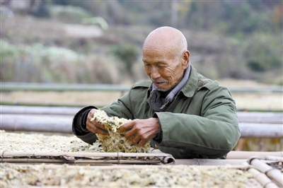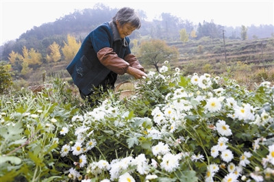 又值杭白菊收获的季节,记者昨日在新县田铺乡看到家家户户忙着采摘和晾晒菊花。近年来,新县从浙江桐乡市引进杭白菊,大力发展杭白菊等特色种植业,农民增收效果明显。尤其是青壮劳力纷纷外出打工,这也为当地留守老人和留守妇女等当地农村剩余劳动力提供了在家门口打工赚钱的机会。图①为67岁的张大娘在家门口的菊花田里采摘菊花。图②为采菊归来。图③为这位老大爷虽然年近八十,还能独立完成翻晒菊花的工作。本报记者 郝光 摄