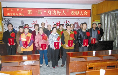 11月13日,羊山新区南京路街道党工委、办事处召开第一届“身边好人”表彰大会,14名孝老爱亲的榜样、爱岗敬业的表率、助人为乐的楷模、诚实守信的典型受到表彰,展示了该办事处公民道德建设的丰硕成果。刘志勇 摄