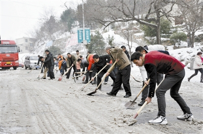 为保障道路畅通,该县交通运输局全体干部职工上路铲雪,清扫路面。 |