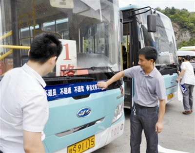 该县交通运输局认真开展“道路交通安全月”活动,该局局长李宏(左二)亲自将宣传标语贴到公交车上。 |