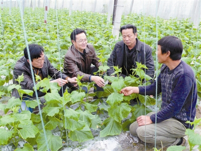 为切实增加农民收入,平桥区积极引导和鼓励外出务工返乡人员创办各种形式的农业合作经济组织,组织农技人员深入田间地头为他们送科技资料、信息,聘请农业专家搞好农业科技培训和服务。图为日前技术人员在高梁店乡李田村蔬菜基地指导农民科学种植反季节蔬菜时的情景。 李建设 摄