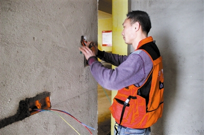 家装e站除了有一套严格的施工标准外,还和许多知名品牌合作,如梦天木门、大自然地板、东鹏瓷砖、科勒卫浴等。家装e站这种网上购买、线下体验的O2O模式,十分注重客户的评价。不管是好评还是差评都摆在那里,客户可以直接看到。高楠表示:“业主经过比较,选择相信家装e站并在网上下单,我们就要对得起业主的信任,用心去装修,让业主少操心、多放心,将来住得也舒心。业主自然就会给我们好评。装修就是这么简单。”(图为中乐百花小区一施工现场,装修工人正在检查电路。)