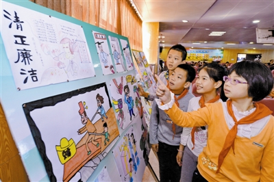 11月24日,福州市麦顶小学学生在参观同学创作的漫画作品。近年来,福州市纪委联合教育部门,广泛开展廉政文化进校园活动,通过漫画、书法、剪纸等形式,将廉政教育融入寓教于乐当中,在校园营造“崇廉尚洁”的良好氛围,培养学生从小树立正确的道德观、价值观和人生观。 新华社记者 张国俊 摄